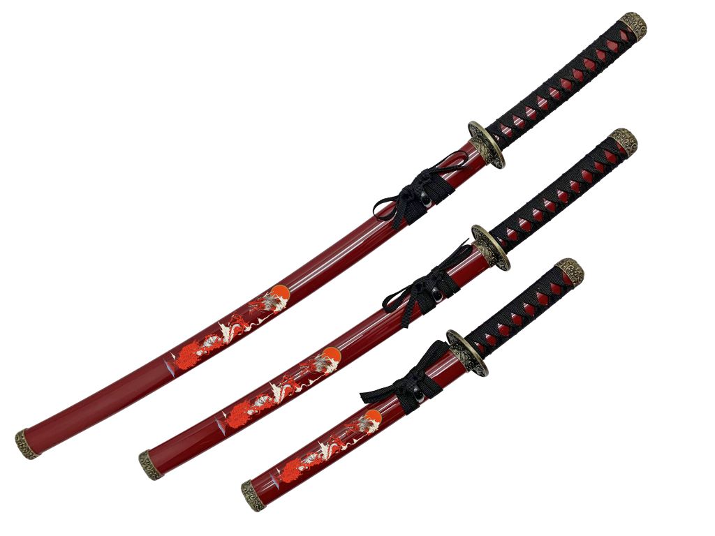 39″ Dragon Print Samurai Sword 3pcs Set w/ stand Style 2-Red (T60085RD)