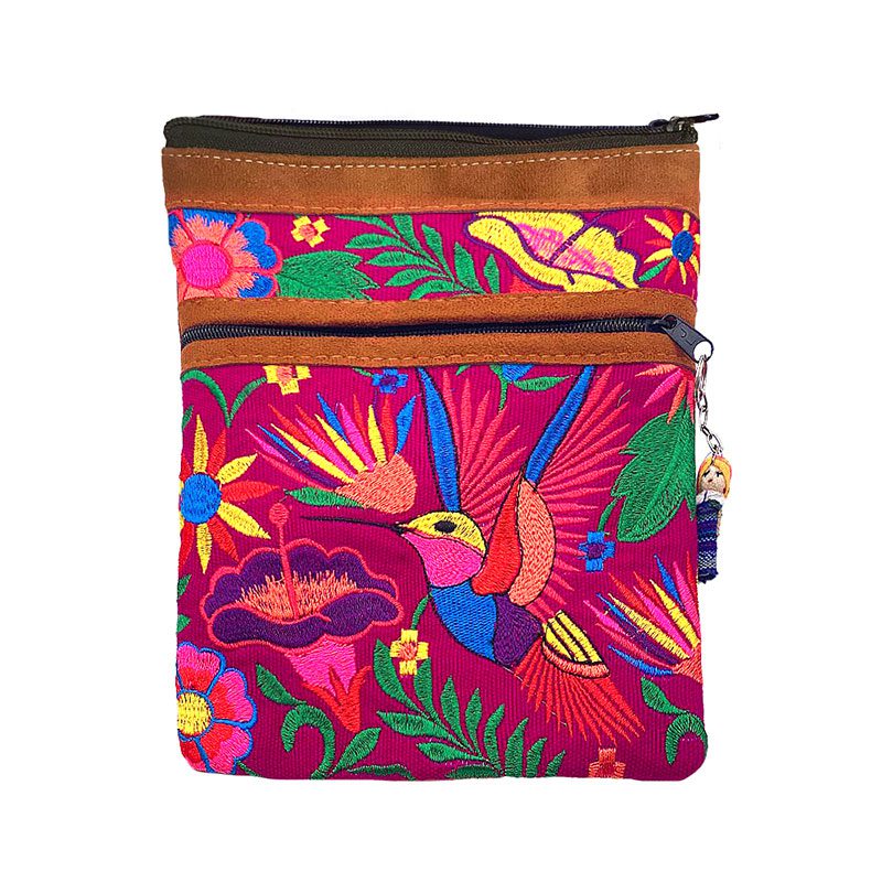 Medium-sized rectangle shaped slim cross body purse passport bag with multicolored embroidered hummingbird and flower design and suede. Bag is handmade with embroidered cotton and vegan leather suede. Worn with adjustable cross body strap for a comfortable fit.