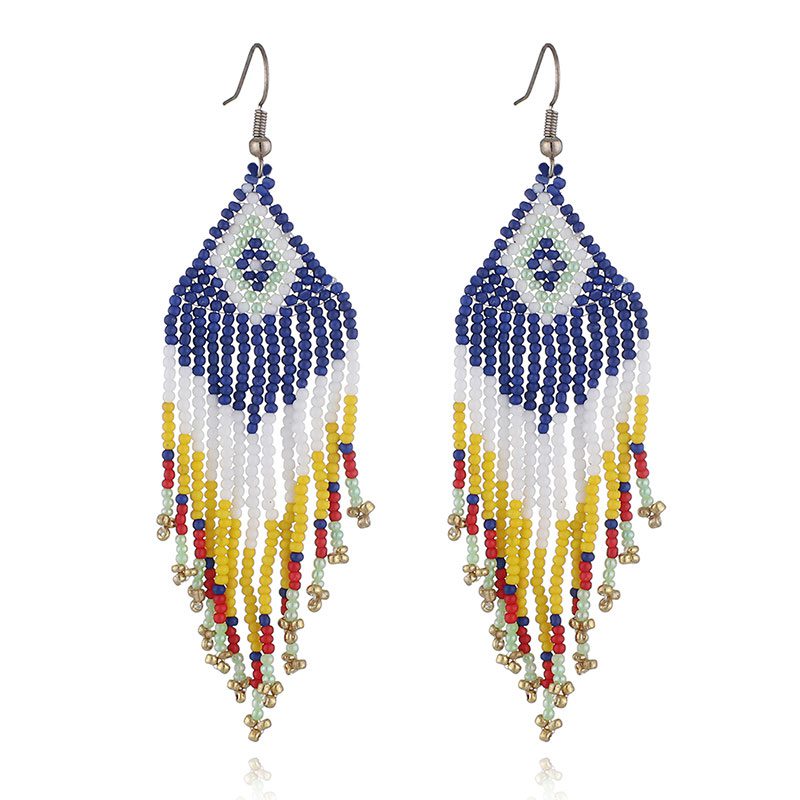 Beaded Indigenous Earrings Material: Aluminum Alloy & Bead Colours: D.Blue/White/Yellow Quantity: 12/Pack Sold by Pack Only!