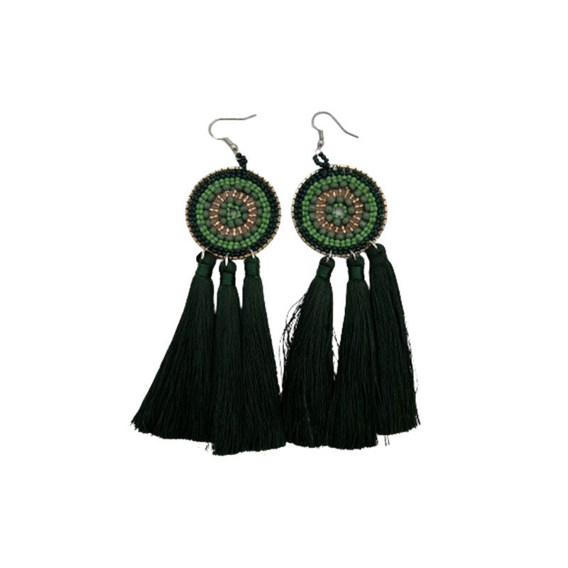 Beaded Medallion Indigenous Earrings Material: Beads, Sting & Metal Color: Dark Green Quantity: 12/Pack Sold by Pack Only!