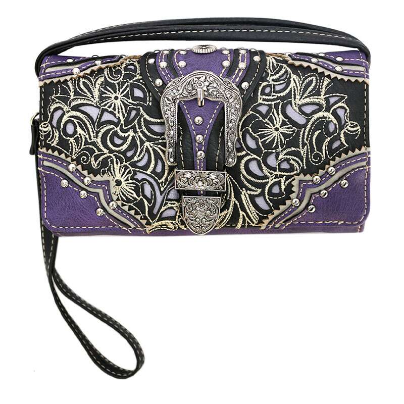 Justin West Stone Buckle Rhinestone Western Floral Embroidery Trifold Wallet – Purple-P2060W141N