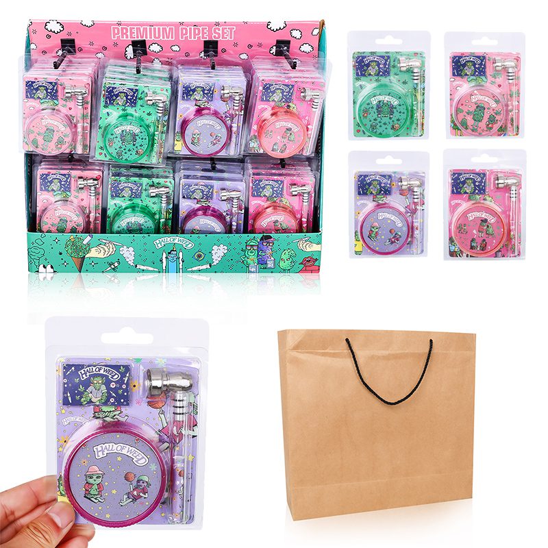 Smoking Pipe and Grinder Set Color: MIx Pipe: 95*26mm Grinder: 60*25mm Mesh Slices:18mm Weight: 66g/pcs Material: Plastics, Stainless Steel ,Glass 32/Pcs/Display Sold by Display!
